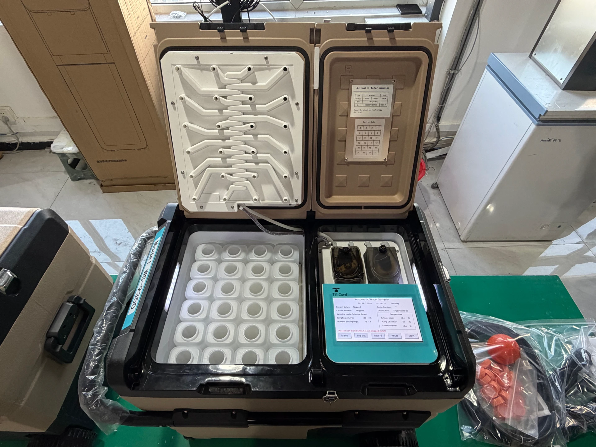 Equipped with a refrigerator for refrigerated storage of water samples; |
