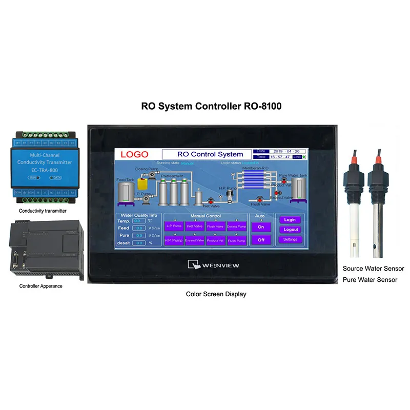 سیستم کنترل اسمز معکوس صفحه نمایش رنگی لمسی ROS-8100 یک سیستم کنترل چند منظوره با ترکیبی از صفحه نمایش لمسی مقاومتی چهار سیمه با کنترل فرآیند اسمز معکوس و مانیتور رسانایی آنلاین است، که عمدتا برای کنترل سیستم و نظارت بر کیفیت آب و کنترل سیستم اسمز معکوس استفاده می شود.